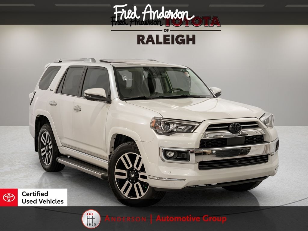 CARFAX One-Owner. Clean CARFAX. Priced below KBB Fair Purchase Price! *Full Family Plan* INCLUDES OIL CHANGES FOR LIFE!, Only One Owner and Accident Free Carfax!!, Navigation, Bought new here at Fred Anderson Toyota, Alloy wheels / Premium Wheels, Bluetooth, Hands-Free, Leather Seats, Local Trade, Star Safety System with Active Breaking Technologies, Keyless Entry, Keyless Start, Backup Camera, Sunroof / Panoramic Roof, We will buy your car and pay top dollar for it, even if you don't buy ours!!, USB Port, Redwood w/Leather Seat Trim, Blind Spot Monitor (BSM), Dual Zone Auto Climate Control, Garage Door Opener, Limited Package, Moonroof w/Tilt Up & Slide, Outside Rear View Mirror, Panoramic Back Monitor, Silver Roof Rails. Check out all these great options Limited Package (Blind Spot Monitor (BSM), Dual Zone Auto Climate Control, Garage Door Opener, Moonroof w/Tilt Up & Slide, Outside Rear View Mirror, Panoramic Back Monitor, and Silver Roof Rails), Toyota Gold Certified Certified, Redwood w/Leather Seat Trim, 15 Speakers, 3.727 Axle Ratio, 4-Wheel Disc Brakes, ABS brakes, Air Conditioning, Alloy wheels, AM/FM radio: SiriusXM, Anti-whiplash front head restraints, Apple CarPlay/Android Auto, Auto High-beam Headlights, Auto-dimming Rear-View mirror, Automatic temperature control, Brake assist, Bumpers: body-color, Compass, Delay-off headlights, Driver door bin, Driver vanity mirror, Dual front impact airbags, Dual front side impact airbags, Electronic Stability Control, Emergency communication system: Safety Connect with 1-year trial, Front anti-roll bar, Front Bucket Seats, Front Center Armrest, Front dual zone A/C, Front fog lights, Front reading lights, Front wheel independent suspension, Fully automatic headlights, Garage door transmitter: HomeLink, Heated door mirrors, Heated front seats, Heated/Ventilated Front Bucket Seats, Illuminated entry, Knee airbag, Leather Seat Trim, Low tire pressure warning, Memory seat, Navigation System, Occupant sensing airbag, Outside temperature display, Overhead airbag, Overhead console, Panic alarm, Passenger door bin, Passenger vanity mirror, Power door mirrors, Power driver seat, Power moonroof, Power passenger seat, Power steering, Power windows, Radio: Premium Audio w/JBL, Rear anti-roll bar, Rear seat center armrest, Rear window defroster, Rear window wiper, Remote keyless entry, Roof rack: rails only, Security system, Speed control, Speed-sensing steering, Split folding rear seat, Spoiler, Steering wheel mounted audio controls, Tachometer, Telescoping steering wheel, Tilt steering wheel, Traction control, Trip computer, Turn signal indicator mirrors, Variably intermittent wipers, Ventilated front seats, and Wheels: 20" Unique Dual 6-Spoke AlloyStop by and test drive today. Let us show you how affordable we can make it. Remember, we always give you more for your trade and we will buy your vehicle even if you don't buy one from us. See online @ www.FredAndersonToyota.com or see in person @ Fred Anderson Toyota 9101 Glenwood Ave. Raleigh NC, 27617. Recent Arrival! 2022 Toyota Certified. 4Runner Limited RWD Blizzard Pearl 5-Speed with ECT