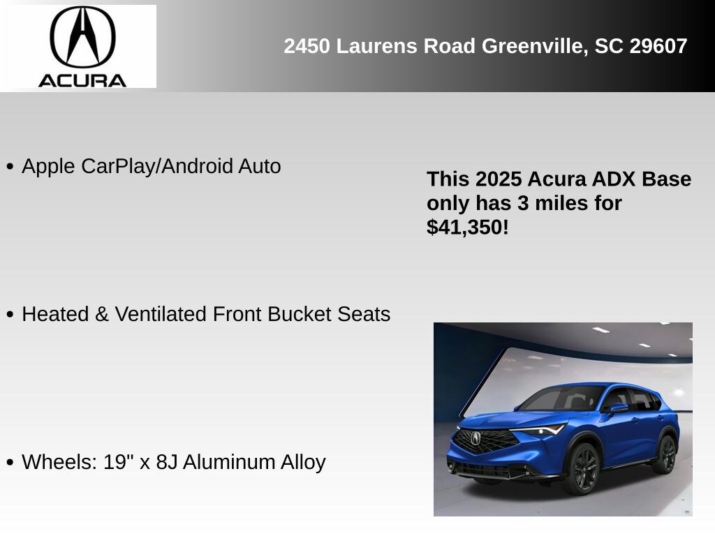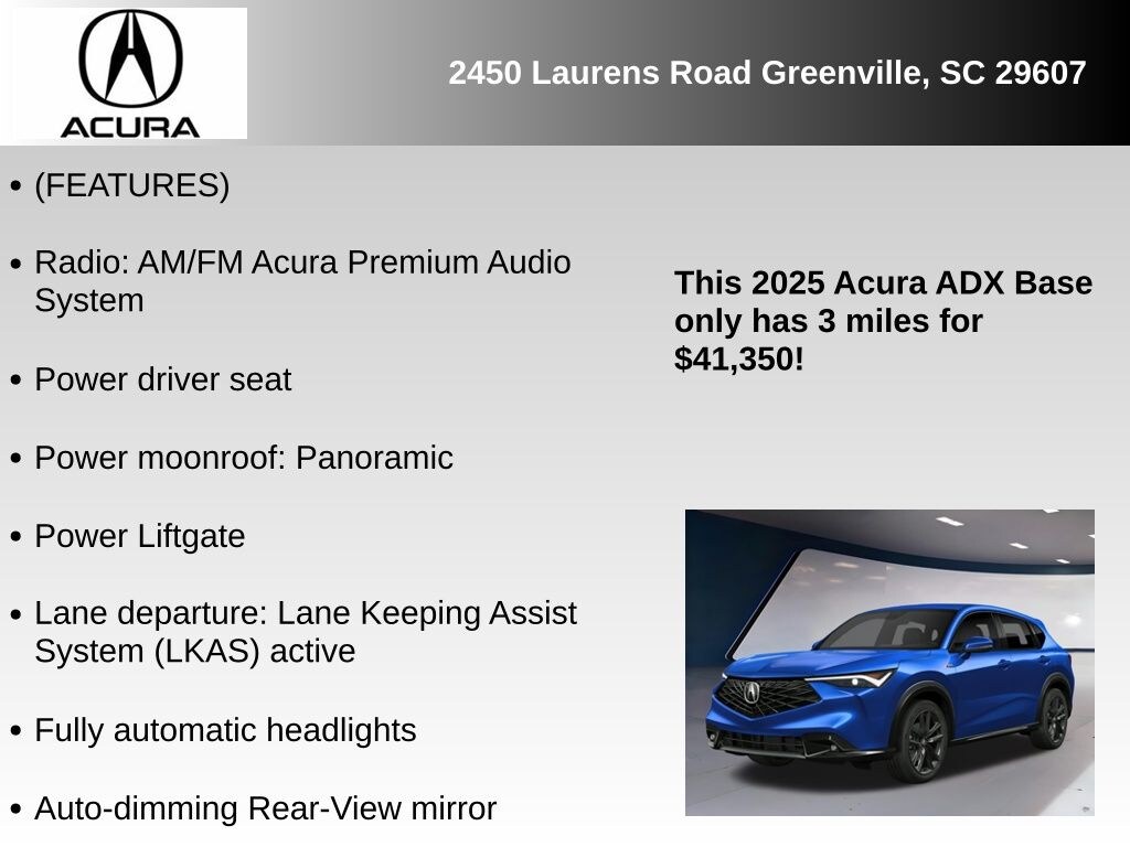 2025 Acura ADX A-Spec Package Crystal Black Pearl (FEATURES), Apple CarPlay/Android Auto, Auto-dimming Rear-View mirror, Fully automatic headlights, Heated & Ventilated Front Bucket Seats, Lane departure: Lane Keeping Assist System (LKAS) active, Power driver seat, Power Liftgate, Power moonroof: Panoramic, Radio: AM/FM Acura Premium Audio System, Wheels: 19" x 8J Aluminum Alloy.