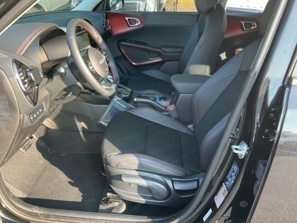2025 Kia Soul GT-Line Fusion Black 4-Wheel Disc Brakes, 6 Speakers, 7.5J x 18" Alloy Wheels, ABS brakes, Air Conditioning, Alloy wheels, AM/FM radio: SiriusXM, Apple CarPlay & Android Auto, Auto High-beam Headlights, Automatic temperature control, Brake assist, Bumpers: body-color, Carpeted Floor Mats, Combination Cloth/Artificial Leather Seat Trim, Compass, Delay-off headlights, Driver door bin, Driver vanity mirror, Dual front impact airbags, Dual front side impact airbags, Electronic Stability Control, Emergency communication system, Exterior Parking Camera Rear, Front anti-roll bar, Front Bucket Seats, Front Center Armrest, Front dual zone A/C, Front reading lights, Front wheel independent suspension, Fully automatic headlights, Heated door mirrors, Illuminated entry, Leather Shift Knob, Leather steering wheel, Low tire pressure warning, Navigation System, Occupant sensing airbag, Outside temperature display, Overhead airbag, Overhead console, Panic alarm, Passenger door bin, Passenger vanity mirror, Power door mirrors, Power moonroof, Power steering, Power windows, Radio data system, Radio: AM/FM/MP3/HD Audio System, Rear seat center armrest, Rear window defroster, Rear window wiper, Remote keyless entry, Speed control, Speed-sensing steering, Split folding rear seat, Sport steering wheel, Sports Pedals, Steering wheel mounted audio controls, Tachometer, Telescoping steering wheel, Tilt steering wheel, Traction control, Trip computer, Turn signal indicator mirrors, Variably intermittent wipers.