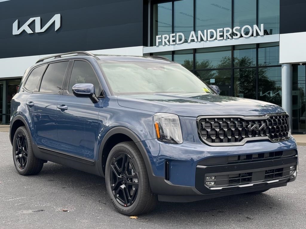 2025 Kia Telluride SX X-Line Midnight Lake Blue 10 Speakers, 3rd row seats: split-bench, 4-Wheel Disc Brakes, ABS brakes, Air Conditioning, Alloy wheels, AM/FM radio: SiriusXM, Apple CarPlay & Android Auto, Auto High-beam Headlights, Auto-dimming Rear-View mirror, Auto-leveling suspension, Automatic temperature control, Brake assist, Bumpers: body-color, Carpet Cargo Mat w/Seatback Protection, Compass, Delay-off headlights, Driver door bin, Driver vanity mirror, Dual front impact airbags, Dual front side impact airbags, Electronic Stability Control, Emergency communication system: 911 Connect, Exterior Parking Camera Rear, Four wheel independent suspension, Front anti-roll bar, Front Bucket Seats, Front Center Armrest, Front dual zone A/C, Front fog lights, Front reading lights, Fully automatic headlights, Garage door transmitter: HomeLink, harman/kardon® Speakers, Heated & Ventilated Front Bucket Seats, Heated door mirrors, Heated front seats, Heated steering wheel, Illuminated entry, Knee airbag, Leather Seat Trim, Leather Shift Knob, Leather steering wheel, Low tire pressure warning, Memory seat, Navigation System, Occupant sensing airbag, Outside temperature display, Overhead airbag, Overhead console, Panic alarm, Passenger door bin, Passenger vanity mirror, Power door mirrors, Power driver seat, Power Liftgate, Power moonroof, Power passenger seat, Power steering, Power windows, Radio data system, Radio: AM/FM Harman Kardon Audio System, Rear air conditioning, Rear anti-roll bar, Rear audio controls, Rear reading lights, Rear side impact airbag, Rear window defroster, Rear window wiper, Reclining 3rd row seat, Remote keyless entry, Security system, Speed control, Speed-sensing steering, Split folding rear seat, Spoiler, Steering wheel mounted audio controls, Tachometer, Telescoping steering wheel, Terracotta Interior Color Package, Tilt steering wheel, Tow Hitch w/Cover, Traction control, Trip computer, Turn signal indicator mirrors, Variably intermittent wipers, Ventilated front seats, Wheels: 20" x 7.5" Black Finish X-LINE Exclusive.