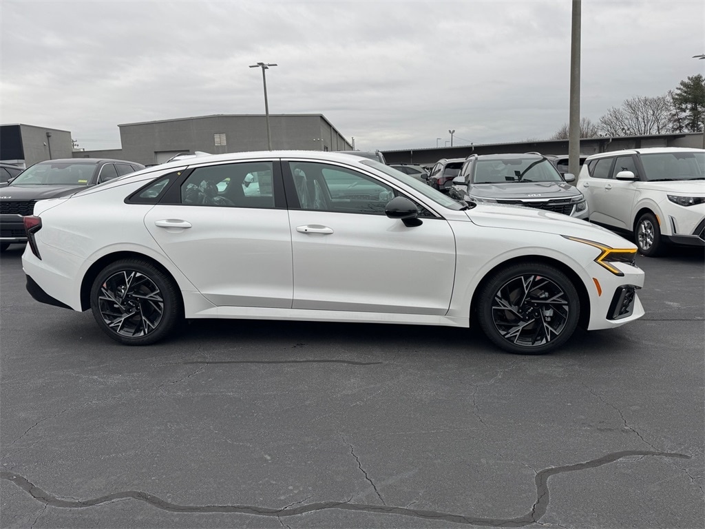 2026 Kia K5 GT-Line Snow White Pearl 4-Wheel Disc Brakes, 6 Speakers, ABS brakes, Air Conditioning, Alloy wheels, AM/FM radio: SiriusXM, Auto High-beam Headlights, Auto-Dimming Mirror with HomeLink, Automatic temperature control, Brake assist, Bumpers: body-color, Carpeted Floor Mats, Delay-off headlights, Driver door bin, Driver vanity mirror, Dual front impact airbags, Dual front side impact airbags, Electronic Stability Control, Emergency communication system: Kia Connect (includes 1 year free trial), Four wheel independent suspension, Front anti-roll bar, Front Bucket Seats, Front Center Armrest, Front dual zone A/C, Front fog lights, Front reading lights, Fully automatic headlights, Heated door mirrors, Heated Front Bucket Seats, Heated front seats, Illuminated entry, Knee airbag, Leather Shift Knob, Leather steering wheel, Low tire pressure warning, Navigation System, Occupant sensing airbag, Outside temperature display, Overhead airbag, Overhead console, Panic alarm, Passenger door bin, Passenger vanity mirror, Power door mirrors, Power driver seat, Power steering, Power windows, Radio data system, Radio: AM/FM Audio System, Rear anti-roll bar, Rear seat center armrest, Rear side impact airbag, Rear window defroster, Remote keyless entry, Security system, Speed control, Speed-sensing steering, Split folding rear seat, Sport steering wheel, Steering wheel mounted audio controls, Tachometer, Telescoping steering wheel, Tilt steering wheel, Traction control, Trip computer, Turn signal indicator mirrors, Variably intermittent wipers, Wheels: 18" x 7.5J Gloss Black Machined Finish Alloy.