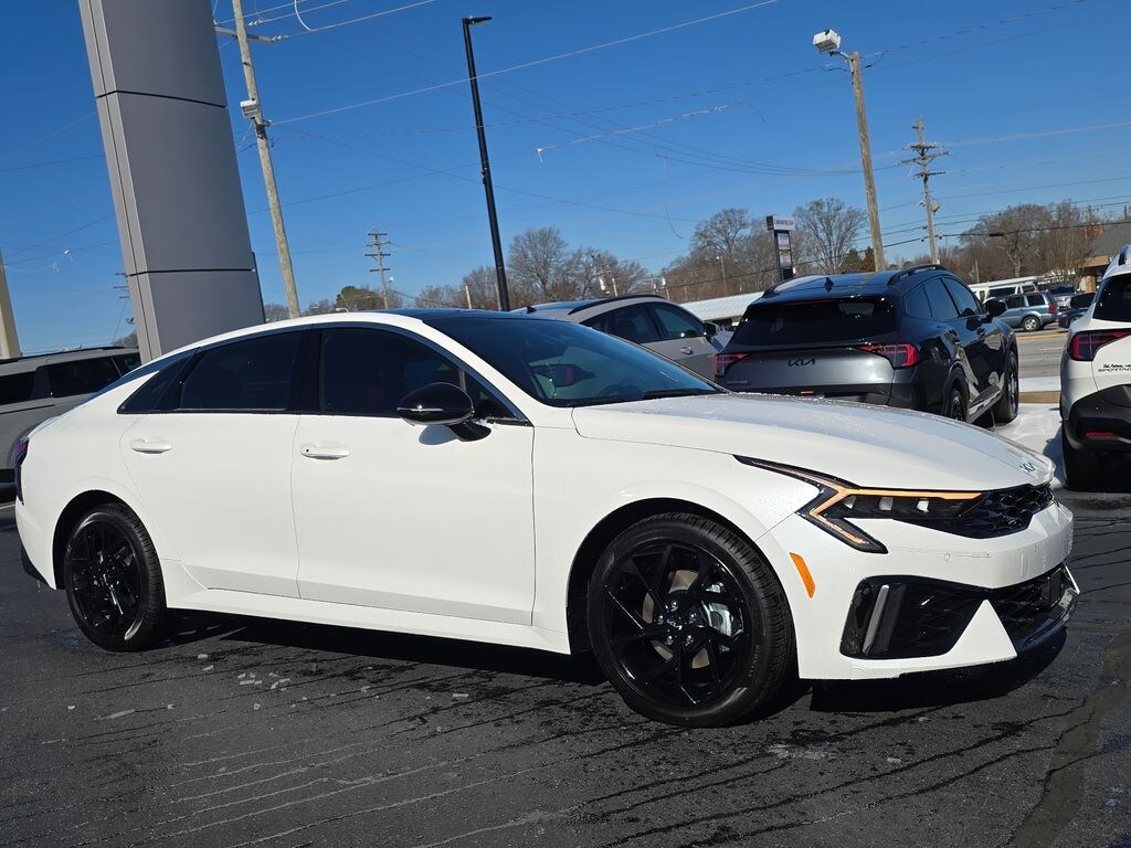 2026 Kia K5 GT-Line Snow White Pearl 4-Wheel Disc Brakes, 6 Speakers, ABS brakes, Air Conditioning, Alloy wheels, AM/FM radio: SiriusXM, Auto High-beam Headlights, Automatic temperature control, Brake assist, Bumpers: body-color, Delay-off headlights, Driver door bin, Driver vanity mirror, Dual front impact airbags, Dual front side impact airbags, Electronic Stability Control, Emergency communication system: Kia Connect (includes 1 year free trial), Four wheel independent suspension, Front anti-roll bar, Front Bucket Seats, Front Center Armrest, Front dual zone A/C, Front fog lights, Front reading lights, Fully automatic headlights, Heated door mirrors, Heated Front Bucket Seats, Heated front seats, Illuminated entry, Knee airbag, Leather Shift Knob, Leather steering wheel, Low tire pressure warning, Navigation System, Occupant sensing airbag, Outside temperature display, Overhead airbag, Overhead console, Panic alarm, Passenger door bin, Passenger vanity mirror, Power door mirrors, Power driver seat, Power steering, Power windows, Radio data system, Radio: AM/FM Audio System, Rear anti-roll bar, Rear seat center armrest, Rear side impact airbag, Rear window defroster, Remote keyless entry, Security system, Speed control, Speed-sensing steering, Split folding rear seat, Sport steering wheel, Steering wheel mounted audio controls, Tachometer, Telescoping steering wheel, Tilt steering wheel, Traction control, Trip computer, Turn signal indicator mirrors, Variably intermittent wipers, Wheels: 18" x 7.5J Gloss Black Machined Finish Alloy.
