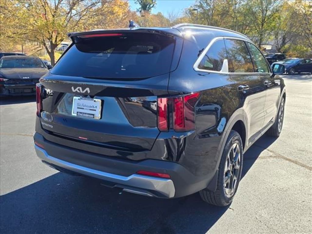 2026 Kia Sorento S Ebony Black 3rd row seats: split-bench, 4-Wheel Disc Brakes, 6 Speakers, ABS brakes, Air Conditioning, Alloy wheels, AM/FM radio: SiriusXM, Apple CarPlay & Android Auto, Auto High-beam Headlights, Automatic temperature control, Brake assist, Bumpers: body-color, Carpeted Floor Mats, Delay-off headlights, Driver door bin, Driver vanity mirror, Dual front impact airbags, Dual front side impact airbags, Electronic Stability Control, Emergency communication system: 911 Connect, Exterior Parking Camera Rear, Four wheel independent suspension, Front anti-roll bar, Front Bucket Seats, Front Center Armrest, Front dual zone A/C, Front reading lights, Full-Length One-Touch Panoroof w/Sliding Sunshade, Fully automatic headlights, Heated door mirrors, Heated Front Bucket Seats, Heated front seats, Illuminated entry, Knee airbag, Leather Shift Knob, Leather steering wheel, LED Interior Lighting, Low tire pressure warning, Mudguards, Occupant sensing airbag, Outside temperature display, Overhead airbag, Overhead console, Panic alarm, Passenger door bin, Passenger vanity mirror, Power door mirrors, Power driver seat, Power steering, Power windows, Radio data system, Radio: AM/FM Standard Sound System, Rear anti-roll bar, Rear reading lights, Rear seat center armrest, Rear side impact airbag, Rear window defroster, Rear window wiper, Remote keyless entry, S Panoramic Sunroof Package, Security system, Speed control, Speed-sensing steering, Split folding rear seat, Spoiler, Steering wheel mounted audio controls, SynTex Artificial Leather Seat Trim, Tachometer, Telescoping steering wheel, Tilt steering wheel, Traction control, Trip computer, Turn signal indicator mirrors, Variably intermittent wipers, Wheels: 18" Gloss Black Alloy.