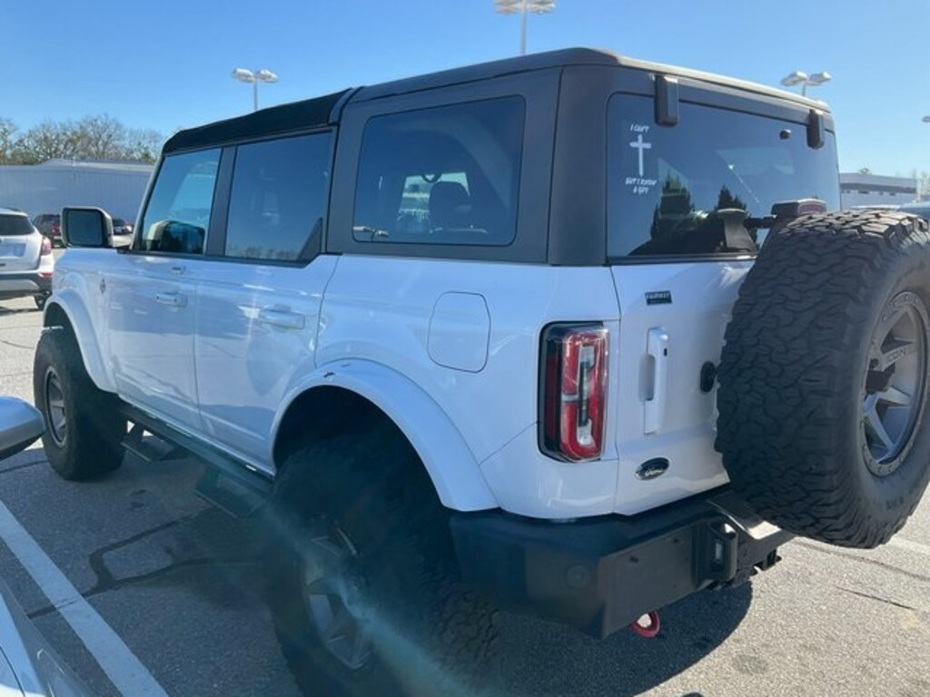 Check out all these great ABS brakes, Compass, Electronic Stability Control, Heated door mirrors, Illuminated entry, Low tire pressure warning, Remote keyless entry, Traction control, 4-Wheel Disc Brakes, 6 Speakers, Air Conditioning, AM/FM radio: SiriusXM with 360L, AM/FM Stereo, Auto High-beam Headlights, Brake assist, Delay-off headlights, Driver door bin, Driver vanity mirror, Dual front impact airbags, Dual front side impact airbags, Emergency communication system: 911 Assist, Exterior Parking Camera Rear, Front anti-roll bar, Front Bucket Seats, Front Center Armrest, Front reading lights, Front wheel independent suspension, Fully automatic headlights, Integrated roll-over protection, Occupant sensing airbag, Outside temperature display, Overhead airbag, Overhead console, Panic alarm, Passenger door bin, Passenger vanity mirror, Power door mirrors, Power steering, Power windows, Radio data system, Security system, SiriusXM Radio w/360L, Speed control, Split folding rear seat, Steering wheel mounted audio controls, SYNC 4, Tachometer, Telescoping steering wheel, Tilt steering wheel, Trip computer, and Variably intermittent wipers. Recent Arrival! Oxford White 2022 Ford Bronco Outer Banks CARFAX One-Owner. Odometer is 17144 miles below market average! ABS brakes, Compass, Electronic Stability Control, Heated door mirrors, Illuminated entry, Low tire pressure warning, Remote keyless entry, Traction control.