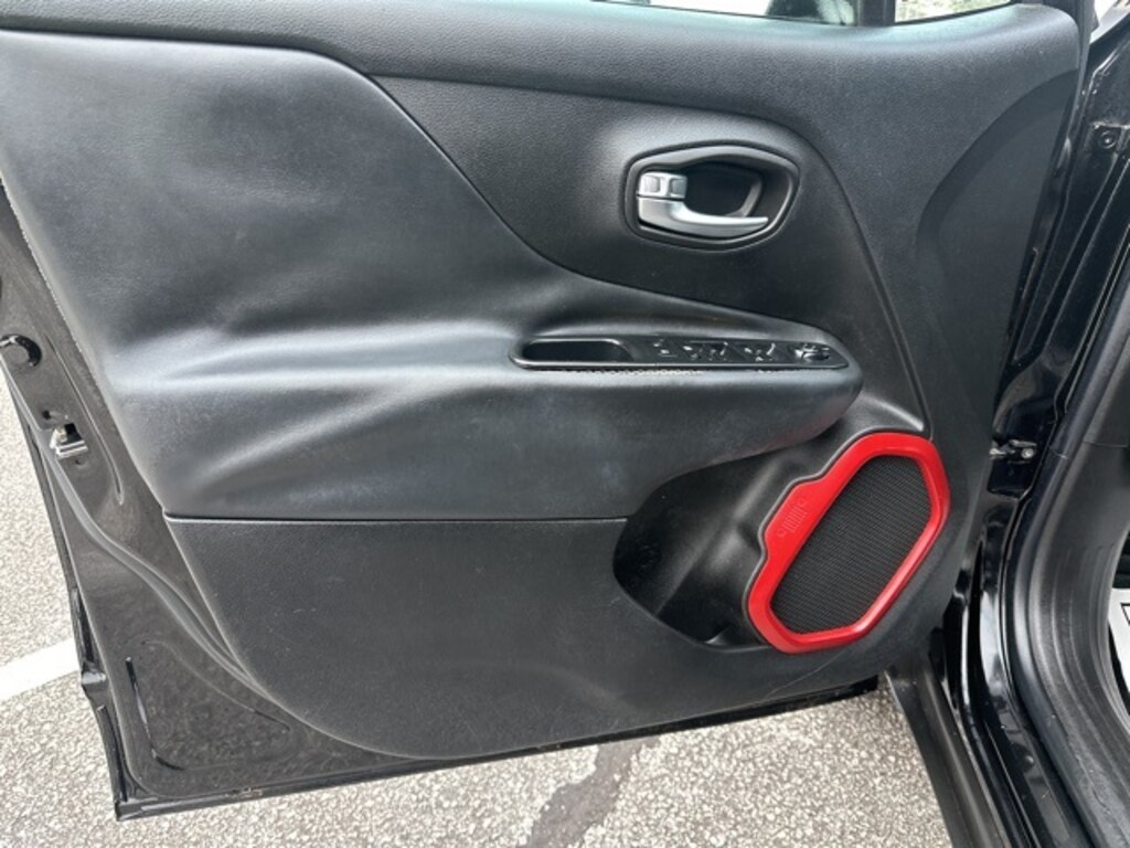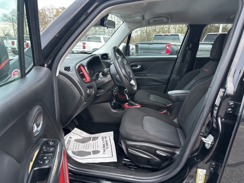 Check out all these great 6.5" Navigation Group w/Uconnect (1 Yr Trial (Registration Required), 5-Year SiriusXM Traffic Service, 5-Year SiriusXM Travel Link Service, 6.5" Touchscreen Display, For Details Visit DriveUconnect.com, GPS Navigation, HD Radio, Radio: Uconnect 6.5 Nav, Remote USB Port, SIRIUSXM Traffic, SiriusXM Travel Link, and Uconnect Access), Passive Entry Keyless Go Package, Quick Order Package 27E, Trailer Tow Group (4 Pin Wiring Harness and Class III Receiver Hitch), 115V Auxiliary Power Outlet, 17" x 6.5" Aluminum Wheels, 4-Wheel Disc Brakes, 4.334 Axle Ratio, 6 Speakers, ABS brakes, Air Conditioning, Alloy wheels, AM/FM radio: SiriusXM, Anti-whiplash front head restraints, Body Color Roof, Brake assist, Compass, Delay-off headlights, Driver door bin, Driver vanity mirror, Dual front impact airbags, Dual front side impact airbags, Electronic Stability Control, Four wheel independent suspension, Front anti-roll bar, Front Bucket Seats, Front Center Armrest, Front fog lights, Front reading lights, Fully automatic headlights, Heated door mirrors, Illuminated entry, Knee airbag, Leather Shift Knob, Leather steering wheel, Low tire pressure warning, Normal Duty Suspension, Occupant sensing airbag, Outside temperature display, Overhead airbag, Overhead console, Panic alarm, ParkView Rear Back-Up Camera, Passenger door bin, Passenger vanity mirror, Passive Entry/Keyless Go (DISC), Power door mirrors, Power steering, Power windows, Premium Cloth Low-Back Bucket Seats, Radio data system, Radio: Uconnect 5.0, Rain sensing wipers, Rear anti-roll bar, Rear window defroster, Rear window wiper, Remote keyless entry, Remote Start System, Roof rack: rails only, Speed control, Split folding rear seat, Spoiler, Steering wheel mounted audio controls, Tachometer, Telescoping steering wheel, Tilt steering wheel, Traction control, Trip computer, Turn signal indicator mirrors, Variably intermittent wipers, and VoltmeteR. Recent Arrival! Black 2016 Jeep Renegade Trailhawk **NO ACCIDENT HISTORY ON CARFAX**, **LOCAL TRADE**, **GREAT CARFAX SERVICE HISTORY**. 21/29 City/Highway MPG
