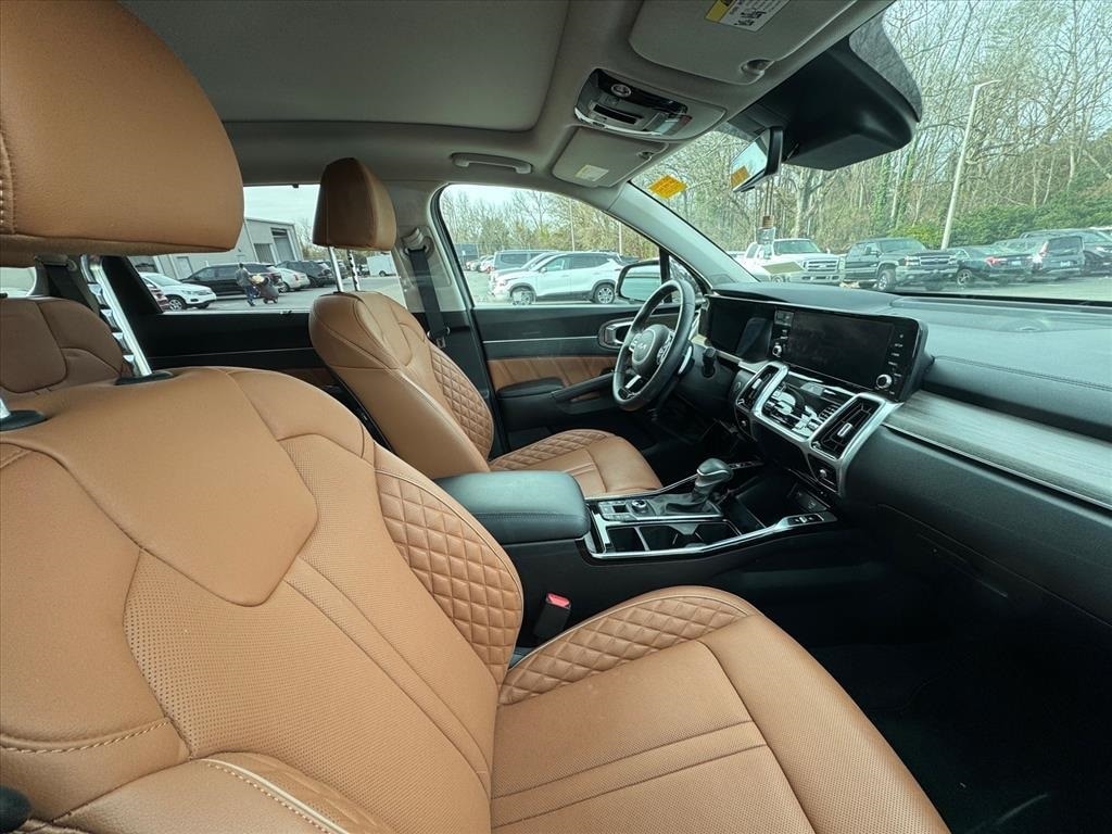CARFAX One-Owner. Clean CARFAX. 2023 Kia Sorento X-Line SX Prestige Wolf Gray Kia Certified Pre-Owned Certified, AWD, 12 Speakers, 3.316 Axle Ratio, 3rd row seats: split-bench, 4-Wheel Disc Brakes, ABS brakes, Air Conditioning, Alloy wheels, AM/FM radio: SiriusXM, Apple CarPlay & Android Auto, Auto High-beam Headlights, Auto-dimming Rear-View mirror, Automatic temperature control, Brake assist, Bumpers: body-color, Carpet Floor Mats, Delay-off headlights, Driver door bin, Driver vanity mirror, Dual front impact airbags, Dual front side impact airbags, Electronic Stability Control, Emergency communication system, Four wheel independent suspension, Front anti-roll bar, Front Bucket Seats, Front Center Armrest, Front dual zone A/C, Front fog lights, Front reading lights, Fully automatic headlights, Garage door transmitter: HomeLink, Heated & Ventilated Front Bucket Seats, Heated door mirrors, Heated front seats, Heated rear seats, Heated steering wheel, Illuminated entry, Knee airbag, Leather steering wheel, Low tire pressure warning, Memory seat, Navigation System, Occupant sensing airbag, Outside temperature display, Overhead airbag, Overhead console, Panic alarm, Passenger door bin, Passenger vanity mirror, Perforated Genuine Leather Seat Trim, Power door mirrors, Power driver seat, Power Liftgate, Power moonroof, Power passenger seat, Power steering, Power windows, Radio data system, Radio: AM/FM Bose Premium Audio System, Rain sensing wipers, Rear air conditioning, Rear anti-roll bar, Rear reading lights, Rear window defroster, Rear window wiper, Remote keyless entry, Roof rack: rails only, Security system, Smart Key w/ Push Button and Remote Start, Speed control, Speed-sensing steering, Split folding rear seat, Spoiler, Steering wheel mounted audio controls, Tachometer, Telescoping steering wheel, Tilt steering wheel, Traction control, Trip computer, Turn signal indicator mirrors, Variably intermittent wipers, Ventilated front seats, Wheels: 8.5J x 20" Matte Gray Alloy, X-Line Rust Interior Color Package, AWD.