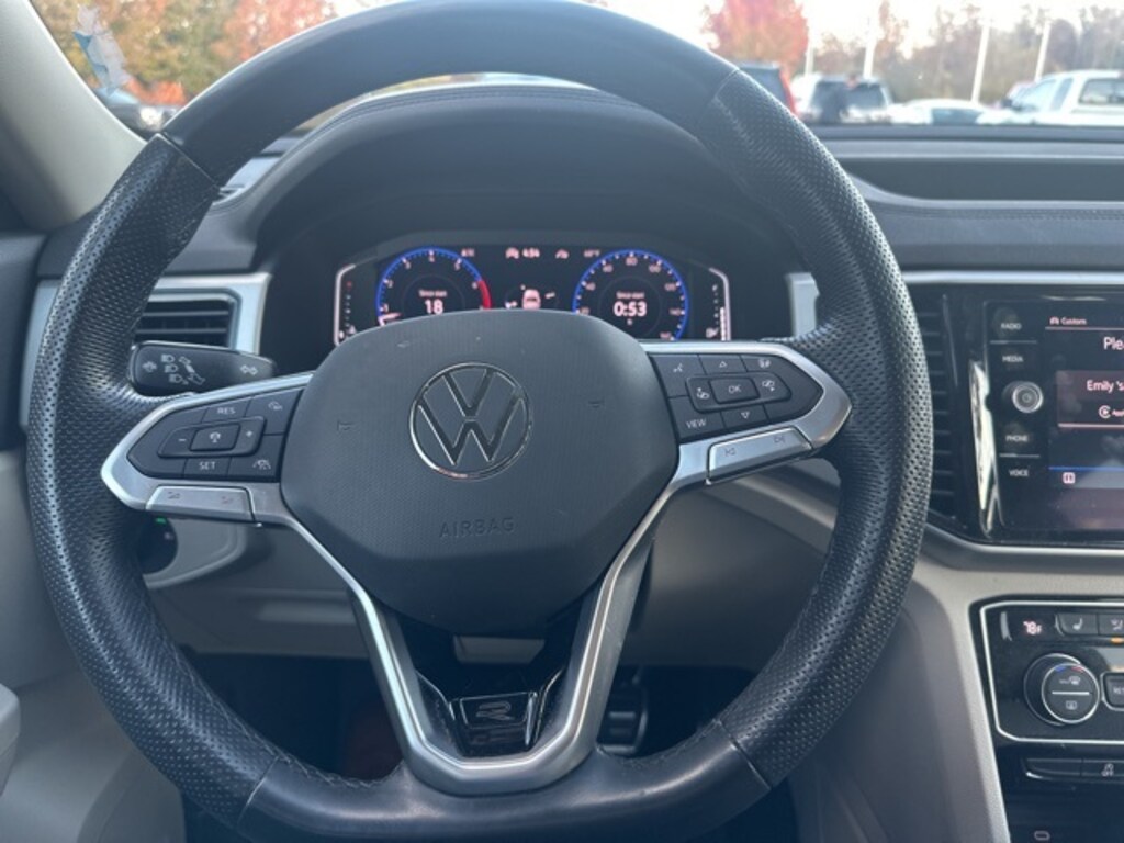 Recent Arrival! 2021 Volkswagen Atlas 3.6L V6 SEL R-Line Deep Black 3.60 Axle Ratio, 3rd row seats: split-bench, 4-Wheel Disc Brakes, 6 Speakers, ABS brakes, Air Conditioning, Alloy wheels, Auto High-beam Headlights, Auto-dimming Rear-View mirror, Automatic temperature control, Brake assist, Bumpers: body-color, Compass, Delay-off headlights, Driver door bin, Driver vanity mirror, Dual front impact airbags, Dual front side impact airbags, Electronic Stability Control, Emergency communication system: VW Car-Net services (capabilities require enrollment or subscription), Exterior Parking Camera Rear, Four wheel independent suspension, Frameless Self-Dimming Rearview Mirror, Front anti-roll bar, Front Bucket Seats, Front Center Armrest, Front dual zone A/C, Front fog lights, Front reading lights, Fully automatic headlights, Heated Comfort Front Bucket Seats, Heated door mirrors, Heated front seats, Heated steering wheel, Heavy Duty Trunk Liner w/VW CarGo Blocks, Illuminated entry, Leather Shift Knob, Low tire pressure warning, Memory seat, Navigation System, Occupant sensing airbag, Outside temperature display, Overhead airbag, Overhead console, Panic alarm, Passenger door bin, Passenger vanity mirror, Perforated V-Tex Leatherette Seating Surfaces, Power door mirrors, Power driver seat, Power Liftgate, Power moonroof, Power passenger seat, Power steering, Power windows, Privacy Cover, Radio data system, Rain sensing wipers, Rear air conditioning, Rear anti-roll bar, Rear reading lights, Rear seat center armrest, Rear window defroster, Rear window wiper, Remote keyless entry, Roof rack: rails only, Rubber Mats Kit - Bench Seat, Security system, Speed control, Speed-sensing steering, Split folding rear seat, Spoiler, Sport steering wheel, Standard Suspension, Steering wheel mounted audio controls, Tachometer, Telescoping steering wheel, Tilt steering wheel, Traction control, Trip computer, Turn signal indicator mirrors, Variably intermittent wipers, Wheels: 21" 2-Tone Machined Alloy.